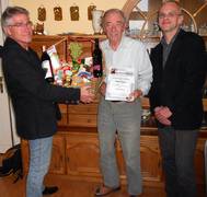 Alle Königsspringer sagen danke für die vorbildliche Vereinsarbeit und ernennen Ferdi Fresen zum Ehrenmitglied auf Lebenszeit. Hier Ferdi mit der Ehrenurkunde des Schachverbandes Süd-Westfalen und den Gratulanten 2. Vorsitzender Manfred Boldt und Kassenwart Rolf Weber.