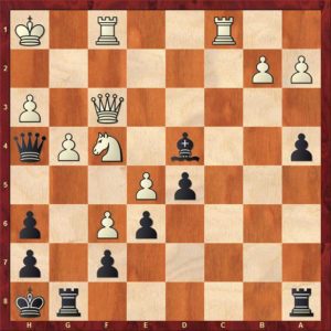 Wie vogelwild es in der Bezirksliga manchmal zugehen kann, zeigt schön die Partie zwischen Klaus Irgel und Michael Kanders an Brett 4. Trotz ihrer durchaus langen Schachpraxis trafen die beiden erst zum zweiten Mal aufeinander – die erste Partie gab es Anfang 1998 im Verbandsklassenkampf zwischen KSP Hagen 1 und SV Letmathe 3, as time goes by … In der aktuellen Partie stand Weiß rund um den 20. Zug glatt gewonnen, die mit Stockfish gefütterte Blechkiste sagt +5, materiell übersetzt also einfach ein Mehrturm. Allerdings setzte Klaus dann nicht konsequent fort, ließ sozusagen wieder Luft an die Stellung und als er nach der Läufervertreibung (s. Diagramm) nicht wie von Schwarz erwartet mit Tc7 fortsetzte, sondern – in dem durchaus verständlichen Bemühen, die bedrohten Bauern auf b2 und vor allem auf e5 zu schützen – mit 26. Sd3??, ist die Stellung nach dem Hebel 26. … h5!! plötzlich in allen Varianten für Weiß verloren.